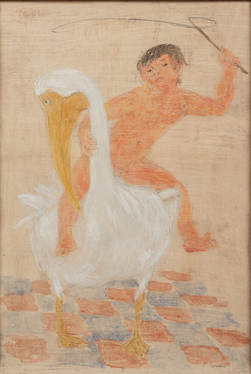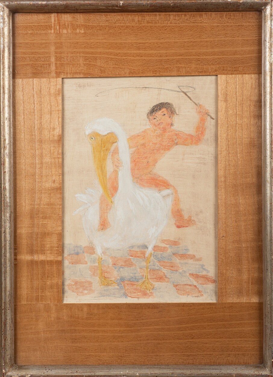 Emanuele Cavalli (1904 - 1981) Fanciullo e pellicano tecnica mista su cartone 29 x 20 cm