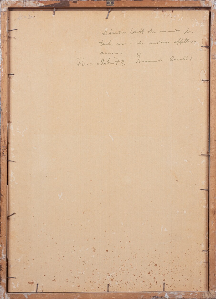 Opera firmata in basso a destra: "E. Cavalli". Recante al retro iscrizioni autografe del Maestro: "A Sandro Conte che ammiro per tante cose e che considero affettuoso amico 12 ottobre '72 Emanuele Cavalli". In cornice