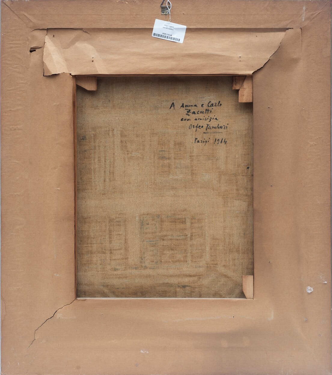 Firmato in basso al centro "Tamburi"; dedicato, situato e datato al retro. Entro cornice