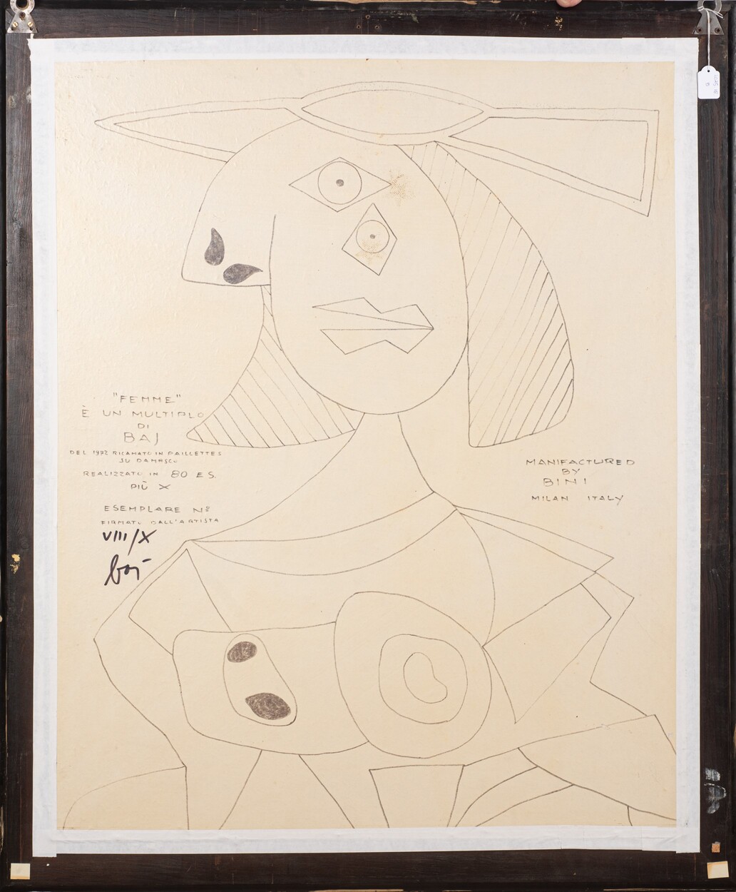 Es. n. VIII/X. Opera firmata in basso a sinistra: "Baj". Iscrizioni al verso: "Femme / è un multiplo7 di / Baj / del 1972 ricamato in paillettes / su damasco / realizzato in 80 es. / Più X / esemplare n. / XVIII/X / firmato dall'artista / VIII/X /Baj / manifactured / by / Bini / Milan Italy". Editore Studio Bini, Milano. In cornice.