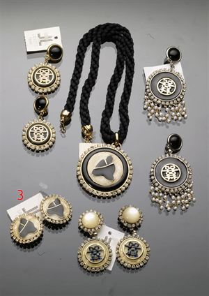 LANCETTI Orecchini a clips circolari con pavè di Swarowski sul bordo, elemento stilizzato raffigurante Budda nero su base madreperlacea, anni '80 Diam cm 4 Round clip earrings with black Buddha motif on white background surrounded by Swarovski crystals