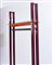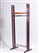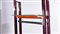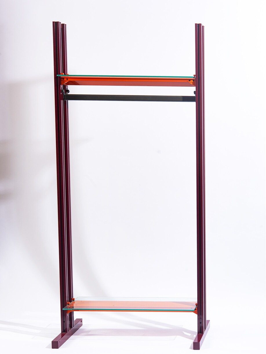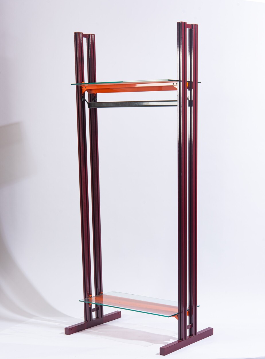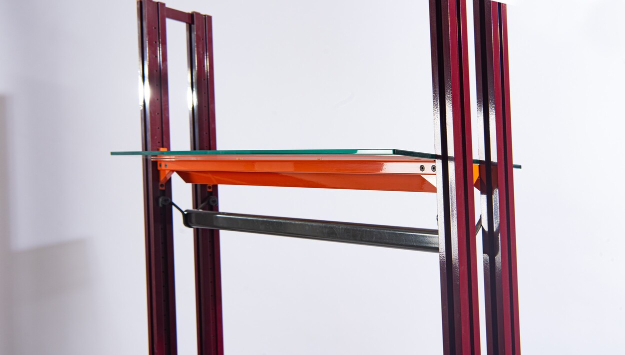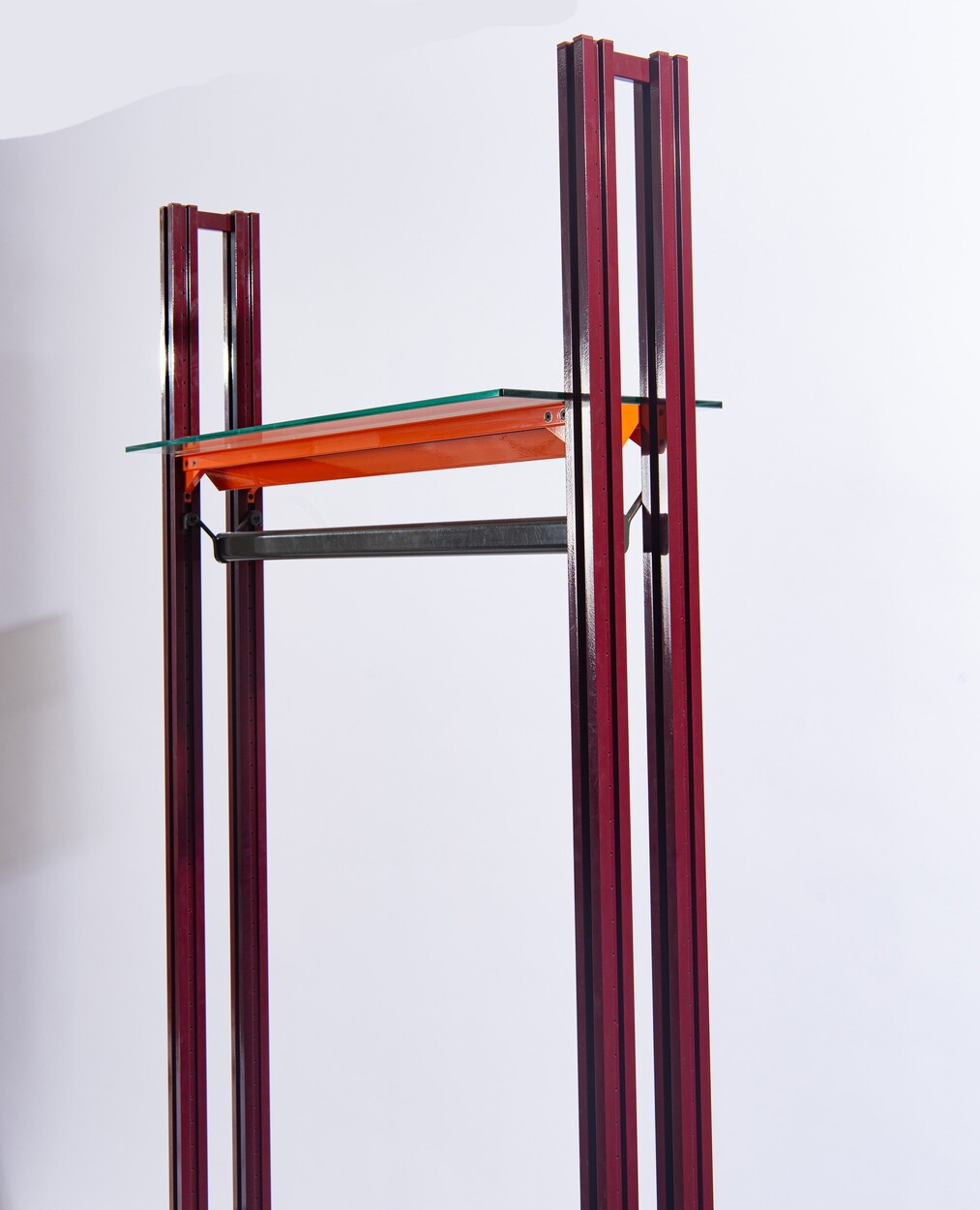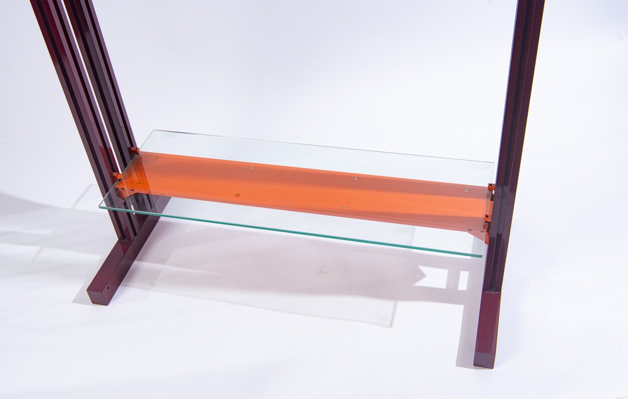 Per Driade. Due montanti in metallo color bordeaux, due mensole orizzontali in vetro poggianti su ripiani color arancione. Asta orizzontale in metallo nero