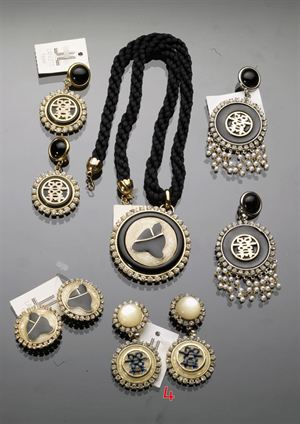 LANCETTI Orecchini con bottone bianco a clips e strass, pendente circolare contornato da pavè di Swarowski,elemento centrale stilizzato di buon auspicio nero su base madreperlacea, anni '80 H cm 7 1980's mother-of-pearl round pendant clip earrings with black good luck symbol surrounded by Swarovski crystals