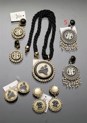 LANCETTI Orecchini con bottone nero a clips e pendente circolare contornato da pavè di Swarowski e perline pendenti, elemento centrale stilizzato di buon auspicio dorato su base smaltata nera, anni '80 H cm 10 1980's round pendant clip earring with gold good luck symbol on black enamel background surrounded by Swarovskis with dangling pearl beads