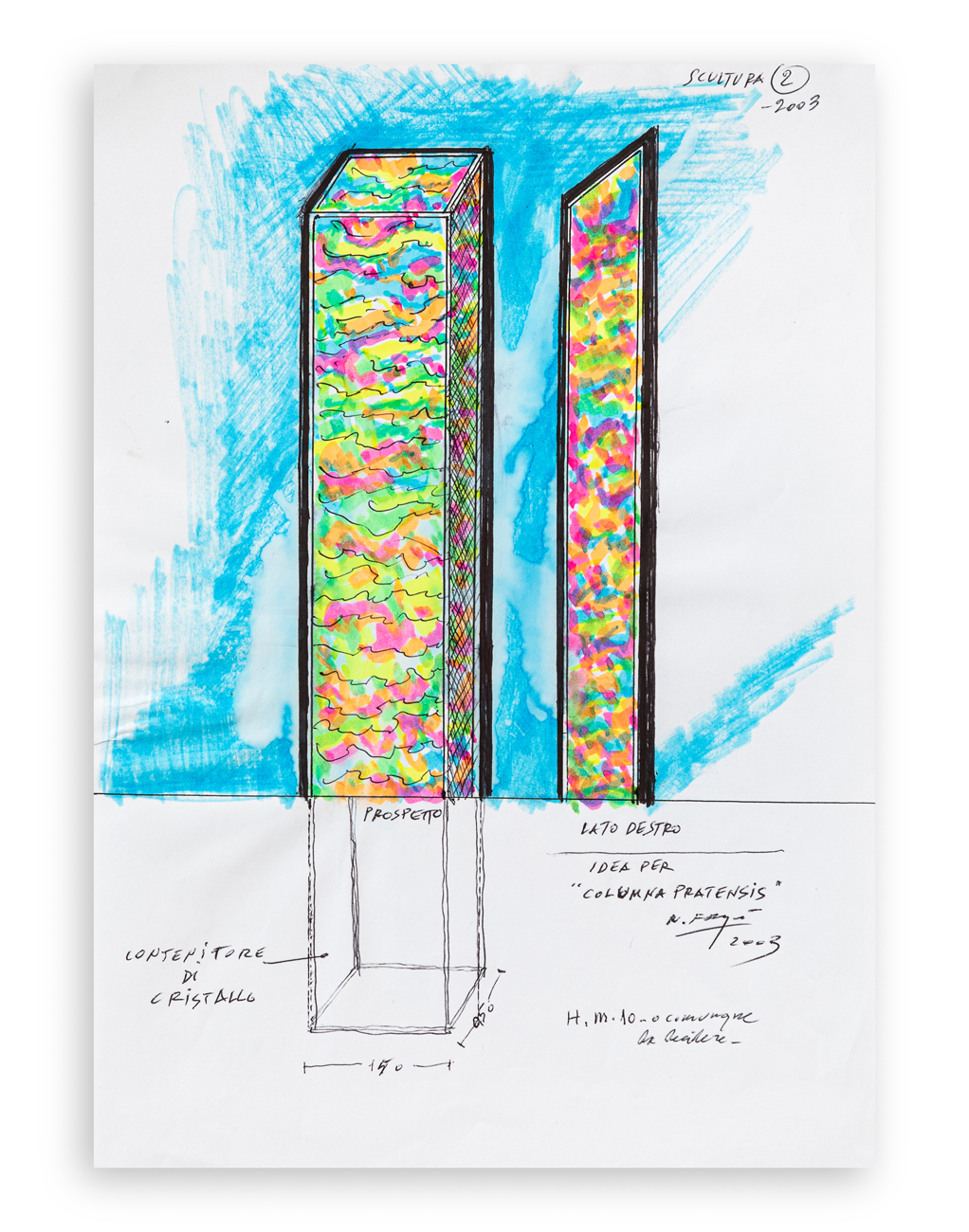 Progetto per colonna monumentale per la città di Prato. La COLONNA del 1975 diventa trasparente contenitore di valori identitari della città.