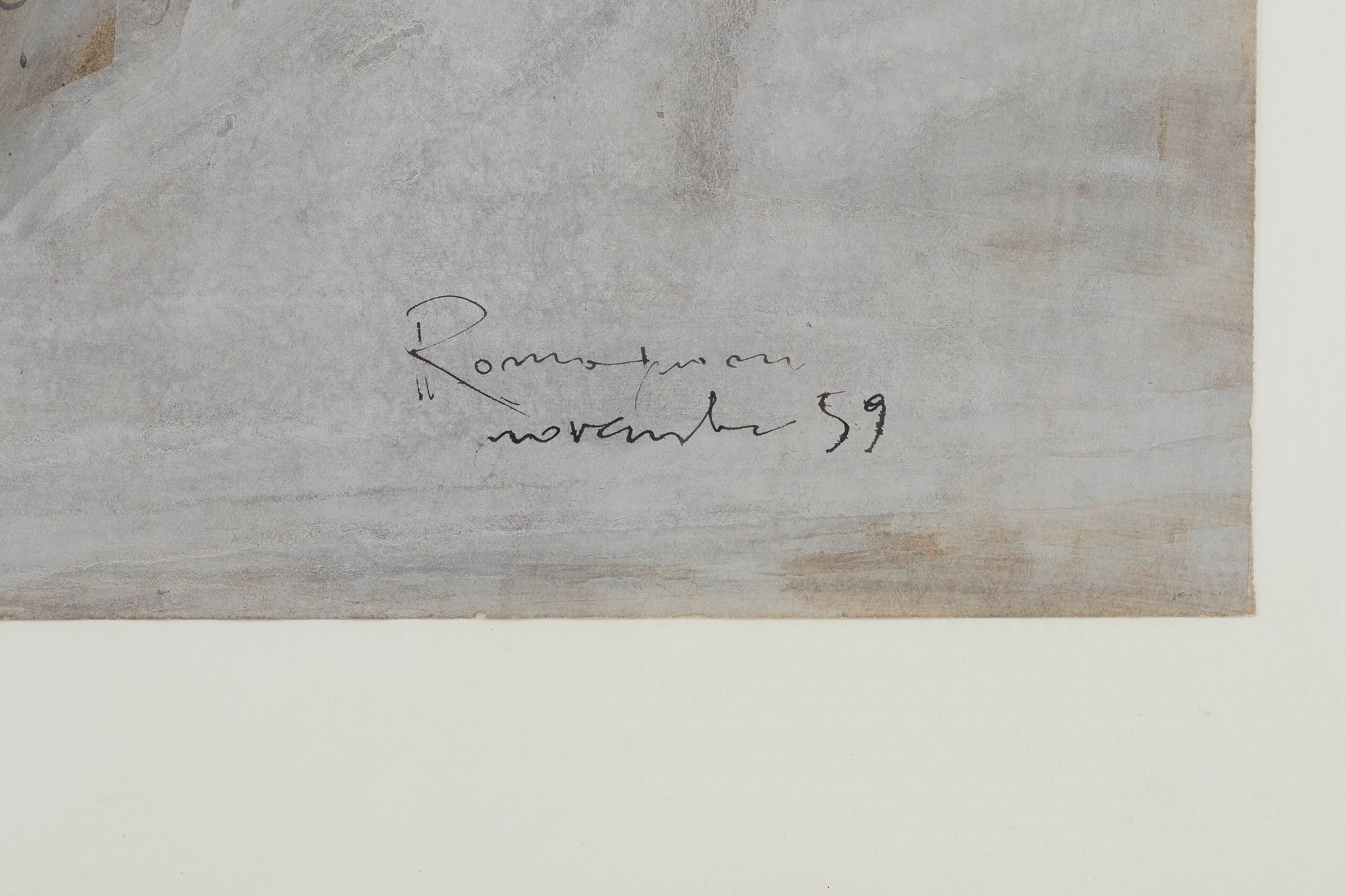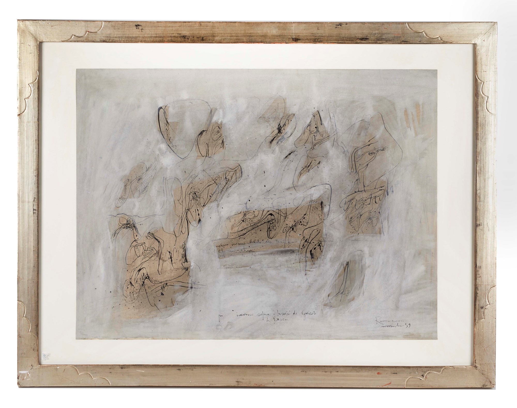 BEPI ROMAGNONI (Milano 1930 - Villasimius 1964) "Invano", 1959. Tecnica mista su carta. Opera firmata e datata in basso a destra Romagnoni novembre 59. Opera intitolata in basso al centro. Opera accompagnata da autentica su fotografia dell'archivio Bepi Romagnoni, Monza. Opera accompagnata da autentica su fotografia della Galleria La Scaletta, San Polo di Reggio Emilia.
