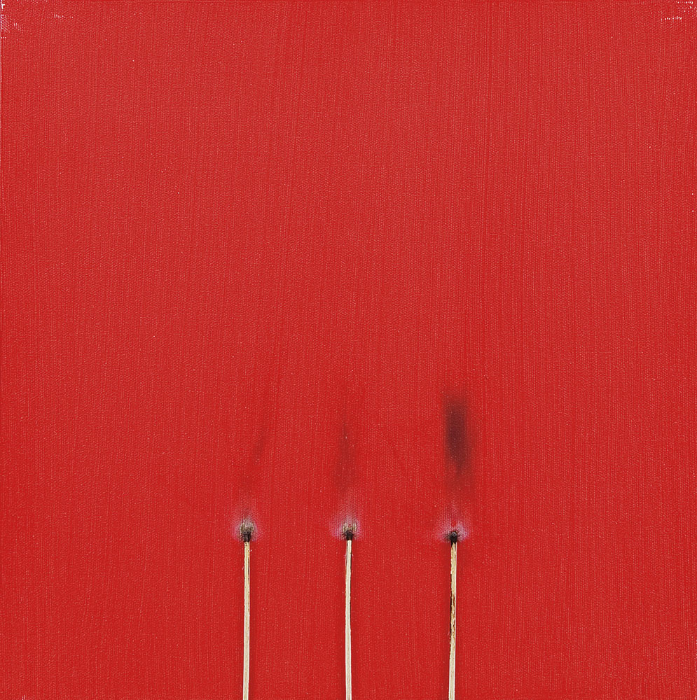acrilici e fiammiferi bruciati su tela cm. 40x40, firma e anno al retro, dichiarazione d'autenticità dell'artista su foto.
