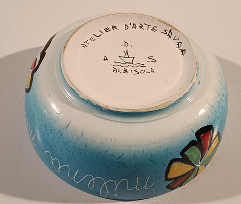 Firma, titolo e anno sulla parte esterna della ciotola. Al retro: Atelier d'arte Savaia (Albisola).