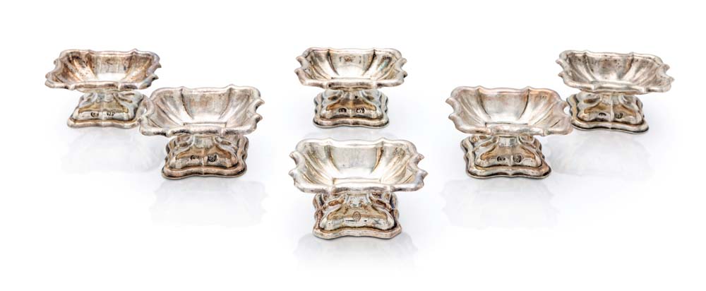 Sei piccole saliere in argento cm 3x6x4,5 - peso complessivo gr. 154...