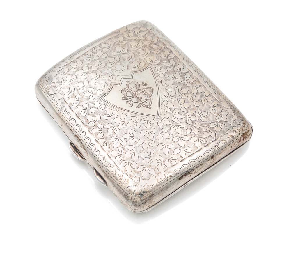 Portasigarette da tasca in argento, Birmingham 1911 cm 8,8x7x1 - gr. 94 fitta decorazione con foglie incise e iniziali SB entro scudo