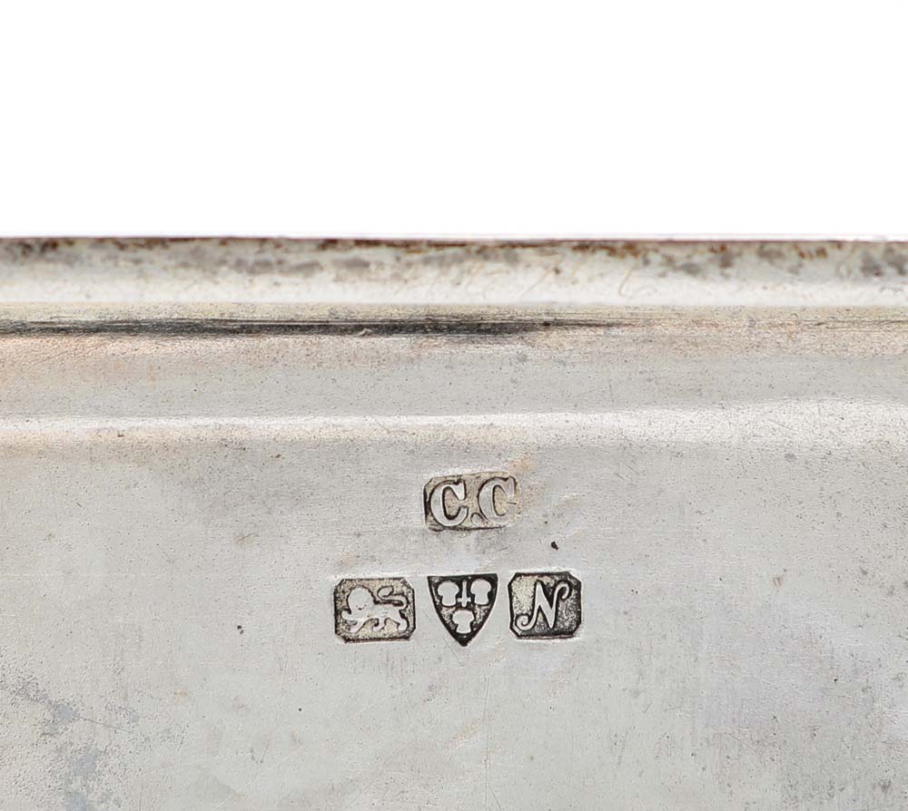 Portasigarette in argento, Chester 1831 cm 10x8x1 - gr. 128 superficie con tracce di incisioni al bulino e medaglione circolare con iscrizione al Capitano Guy Hamilton della H.M.S. Havelock; profili con sottile cornice ramata