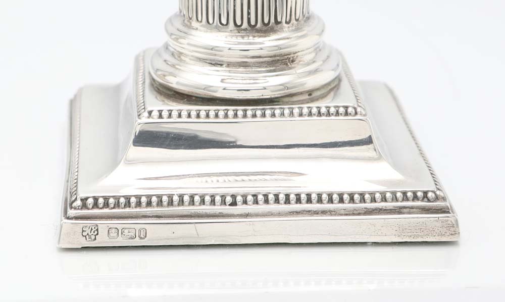 Coppia di candelieri a colonna in argento 925/000, città di Sheffield 1903, argentiere Hawksworth Eyre & co. altezza cm 12,5 - peso complessivo lordo gr. 965 (appesantiti) piede quadrangolare con profili perlinati