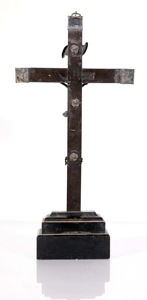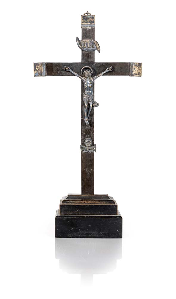 Cristo crocifisso in argento fuso e cesellato, XVIII secolo cm 12x10 - con la croce cm 47x22,5x7 su croce da tavolo in legno ebanizzato con terminali in argento, inserita in un piedistallo parallelepipedo gradinato. La figura del Salvatore è ritratta secondo l'iconografia del Christus Patiens con aureola e corona di spine, la testa lievemente rivolta verso l'alto orientata verso la spalla destra, le braccia tese, il costato reso in evidenza dal ventre fortemente rientrante, le gambe flesse con i piedi sovrapposti trattenuti da un unico chiodo. Sulla sommità titulus crucis e teschio con tibie incrociate nella parte bassa lungo l'asse verticale