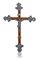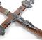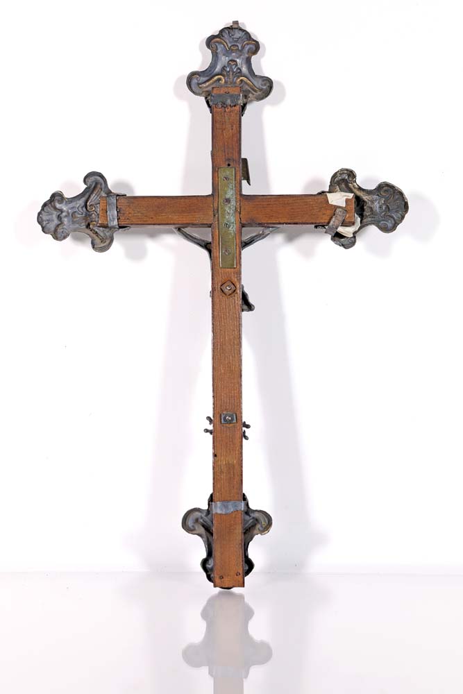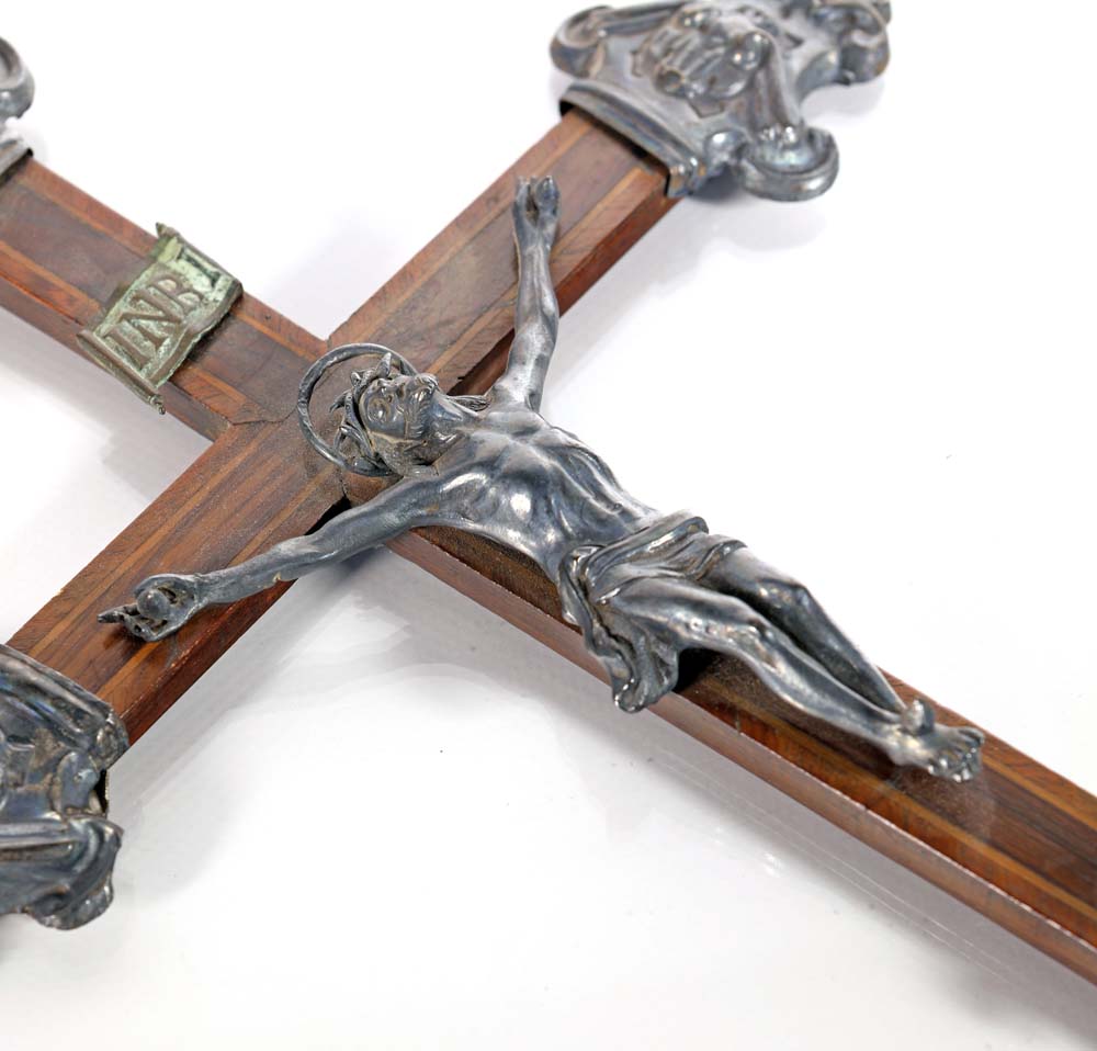 Crocifisso in legno e argento, XVIII secolo cm 41x27 - la figura cm 12x10,5 La raffigurazione di Cristo appena inchiodato sulla croce, con corona di spine e aureola ad anello, cattura l’istante drammatico in cui il corpo di Gesù è stato fissato al legno, ma non è ancora completamente abbandonato alla morte. Il volto esprime un dolore vivo e intenso, con lo sguardo rivolto verso il cielo. Le braccia sono distese e tese, le mani appena trafitte dai chiodi, il corpo è irrigidito dallo sforzo e dal dolore, ma non ancora segnato dai flagelli. Questa immagine mette in risalto l’umanità di Cristo, la violenza del supplizio e l’inizio del suo sacrificio, sottolineando il momento in cui la passione si compie fisicamente ma non è ancora conclusa. Ai piedi teschio con tibie incrociate; titulus crucis in bronzo di epoca posteriore e terminali in lamina d'argento sbalzata.