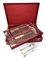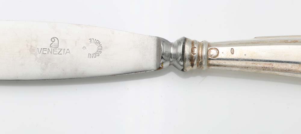 Servizio di posate San Marco in argento 800/000 per dodici posti entro scatola originale peso complessivo gr. 5.030 (esclusi i coltelli) - la scatola cm 12,5x58,5x39,5 12 cucchiai da minestra (cm 19 - gr. 872); 12 forchette da pasto (cm 18 - gr. 832) ed altrettanti coltelli (cm 24,5); 6 forchette da pesce (cm 15,5 - gr. 242) ed altrettanti coltelli (cm 19 - gr. 272); 12 forchette da frutta (cm 15 - gr. 488) ed altrettanti coltelli (cm 19,7); 12 cucchiaini da caffè (cm 9,7 - gr. 142); 12 da tè (cm 12,7 - gr. 284) e 12 da dessert (cm 15,5 - gr. 588); due palette da dolce (cm 25,5 - gr. 260); due forchette ed un cucchiaio da portata (cm 25,5 e cm 24,8 - peso complessivo gr. 318); due posate da insalata in argento e corno (cm 22); forchettone e coltello da arrosto (cm 29 e 30,5 rispettivamente); forchetta e coltello per servire il pesce (cm 21,5 e cm 25,5 rispettivamente - gr. 240) ed un secondo set da portata per pesce di misura maggiore (cm 25 e cm 29,5 - gr. 248); un mestolo (cm 31,5 - gr. 244)