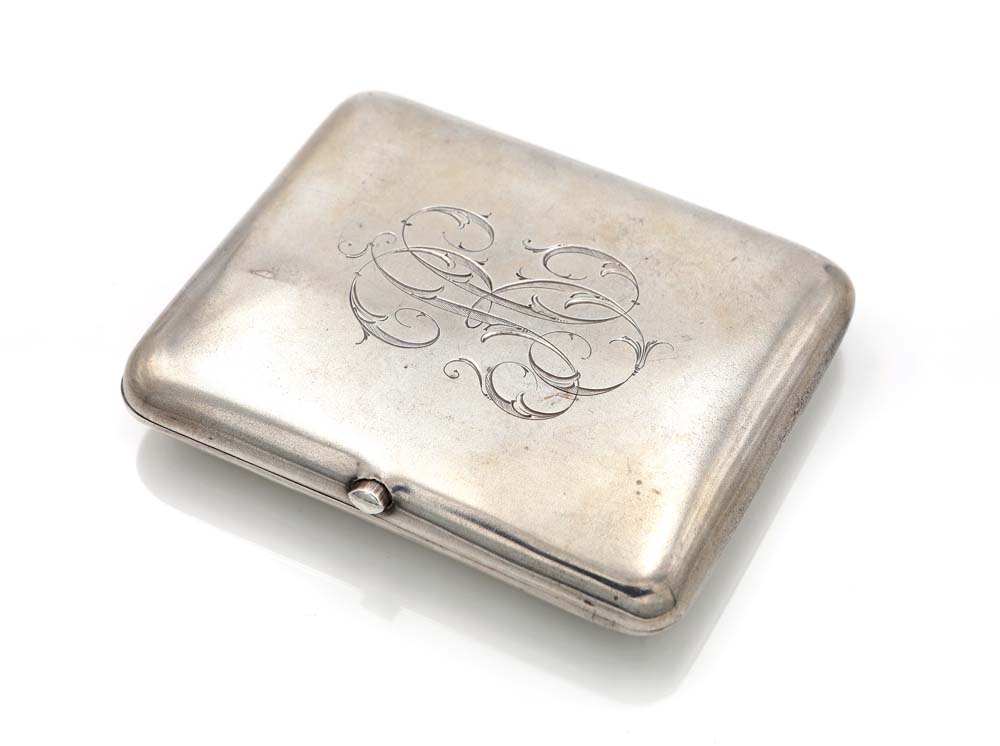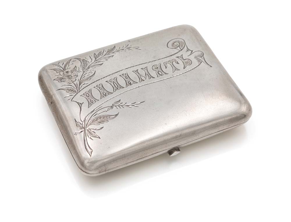 Portasigarette in argento, Russia, fine XIX/inizi XX secolo cm 9,3x7,5x1 - gr. 136 caratterizzata da un cartiglio con iscrizione in cirillico "per ricordo" e da iniziali in corsivo sull'altro lato; apertura a scatto