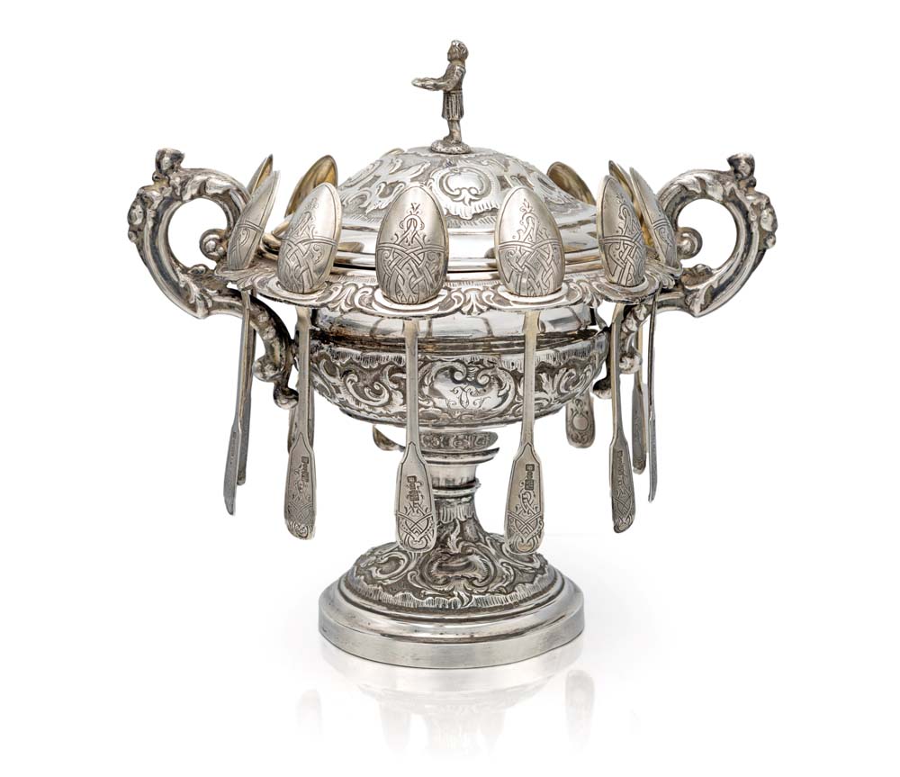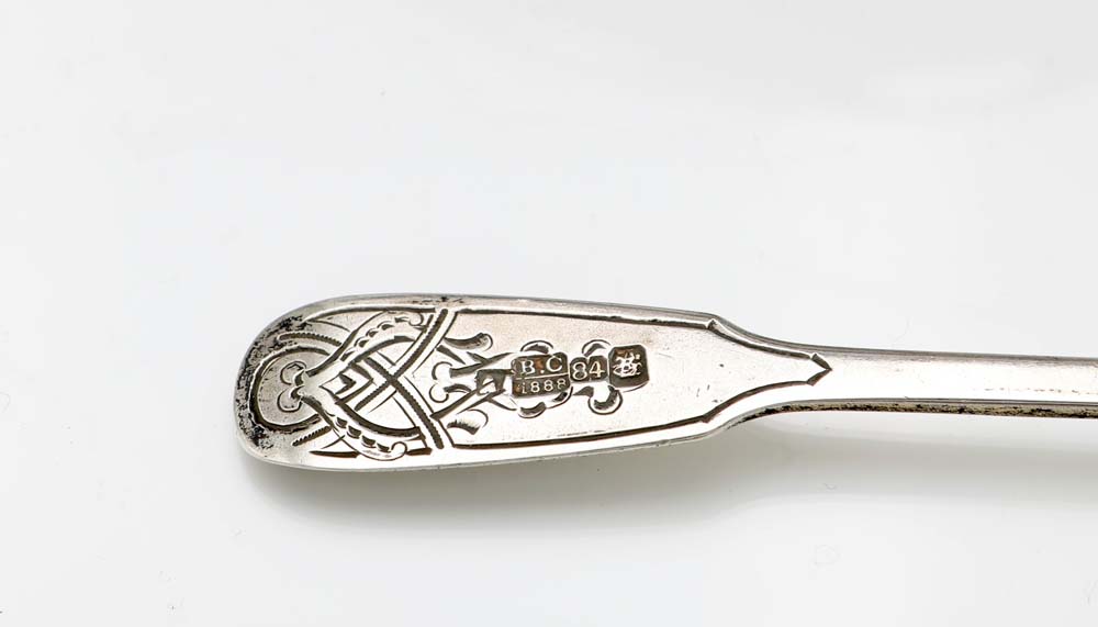 Dodici cucchiaini in argento 875/000, Russia, fine XIX secolo e zuccheriera biansata con coperchio cm 20x22x16 - cucchiaino cm 11,3 - peso complessivo gr. 500 ogni cucchiaio è caratterizzato da paletta ovoidale incisa nella parte convessa ed impugnatura con vertice a scudo inciso sia al recto che al verso. Bolli di titolo e datario 1888