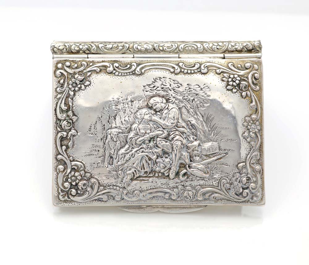 Scatola rettangolare in argento 800/000, Germania, dopo il 1888 cm 10,5x7,5x1,3 - gr. 146 coperchio decorato da una scena galante sbalzata e cesellata racchiusa da una cornice a volute e fiori