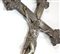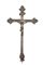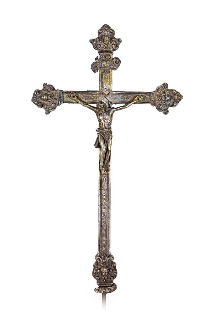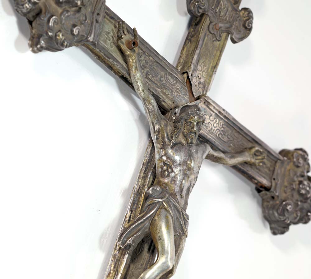 Croce astile argento e lamina d'argento sbalzata, XVII secolo cm 70x39 - Cristo cm 18x20 Corpus Christi realisticamente reso nella parte frontale, rappresentato ancora vivo, con il capo sollevato e reclinato verso la spalla destra, gli occhi socchiusi in un’espressione di sofferenza e forza, la bocca aperta. Il corpo è teso, segnato dalle ferite della passione e le braccia distese. Il volto esprime dolore ma anche dignità, simbolo del sacrificio volontario. Questa rappresentazione evidenzia l’umanità di Cristo nel momento supremo della sua missione redentrice, suscitando compassione e meditazione sul mistero della salvezza. Croce rivestita in lamina con decorazione incisa; titulus crucis e terminali in argento sbalzato. Difetti, restauri e mancanze