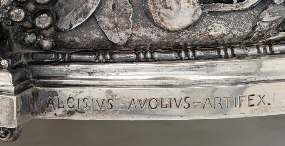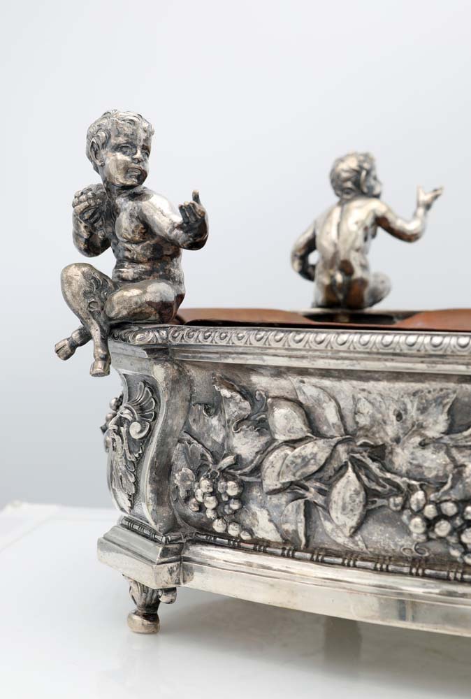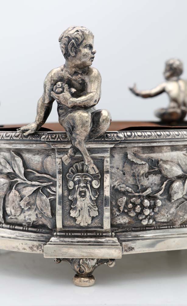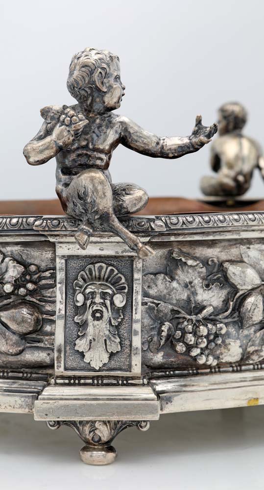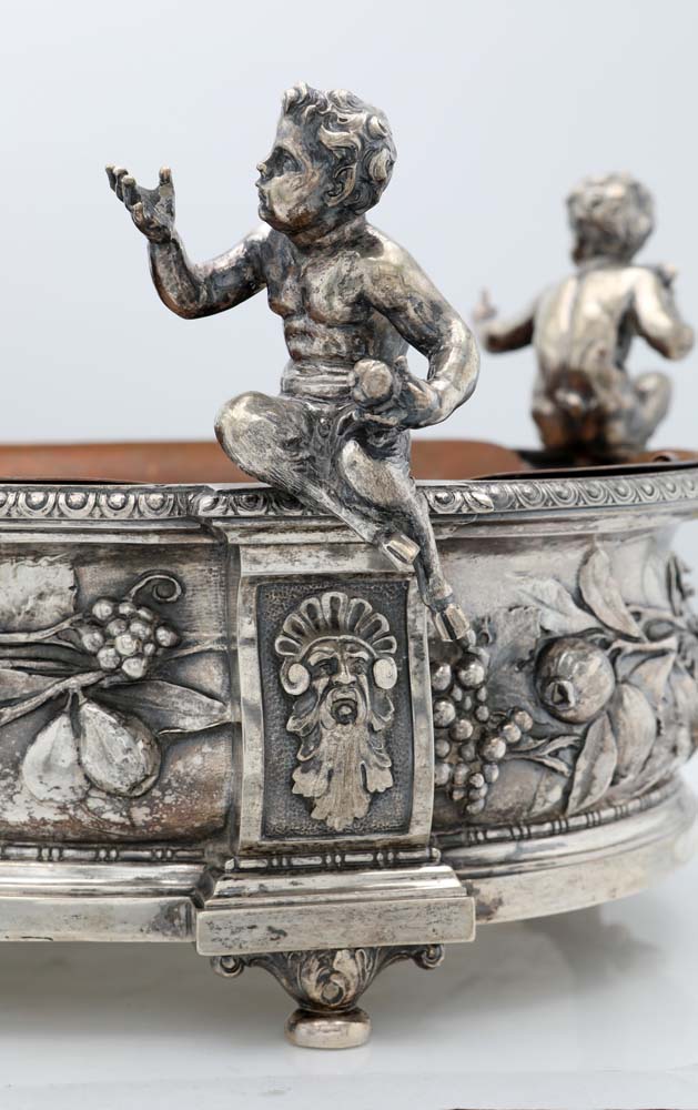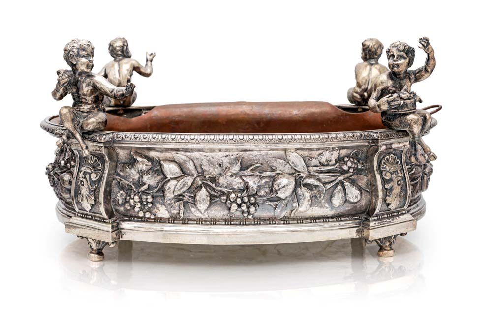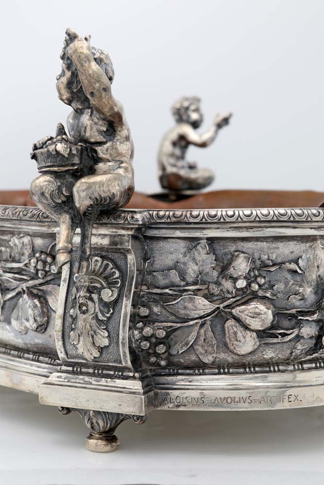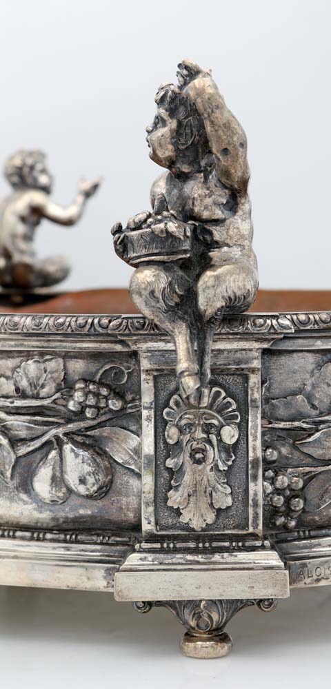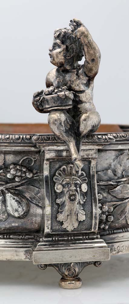 Jardinière centrotavola in argento 800/000 cm 18x37x26,5 - gr. 4270 di forma ovale decorata in bassorilievo da tralci con frutti multiformi interrotti da quattro pilastri squadrati con figure di mascherone su cui siedono figure scultoree di giovani fauni, ognuno ritratto in diversa postura con frutti in mano. All'interno vasca estraibile in rame con prese mobili ad anello. Reca firma incisa lungo il profilo inferiore ALOISIVS - AVOLIVS - ARTIFEX. ("Aloisivs" è la variante latina del nome Luigi).