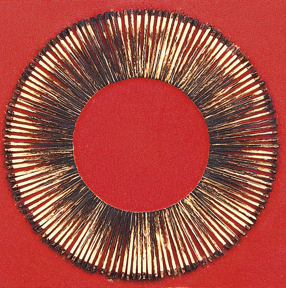 acrilico e fiammiferi bruciati su tavola cm. 20x20, firma e anno al retro, dichiarazione d'autenticità dell'artista su foto.