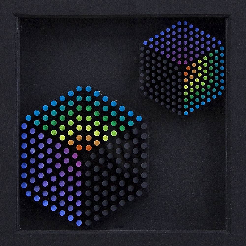 gradienti di luminosità, cilindretti plastici su pannello in faesite cm. 20x20, firma, titolo e anno al retro, dichiarazione d'autenticità dell'artista su foto.