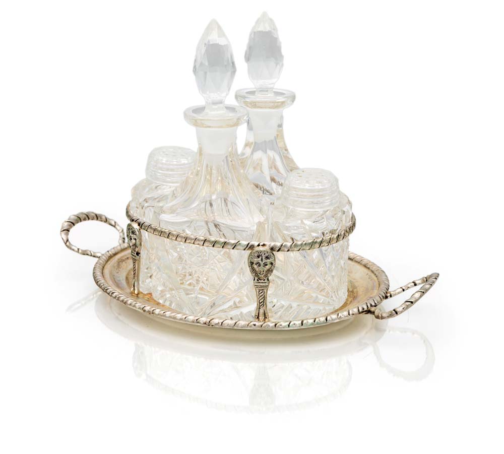 Portacondimenti in argento 800/000 cm 13,5x19x11 - gr. 130 con flaconi per olio, aceto, sale e pepe di forma geometrica in vetro pesante, trattenuti in una struttura ovale con presa centrale