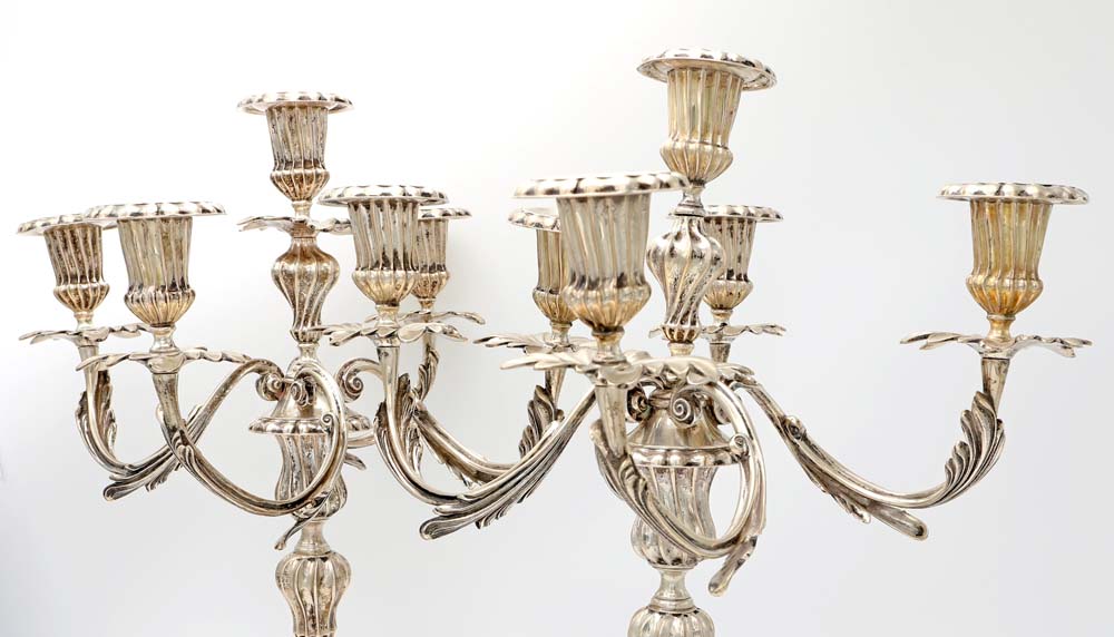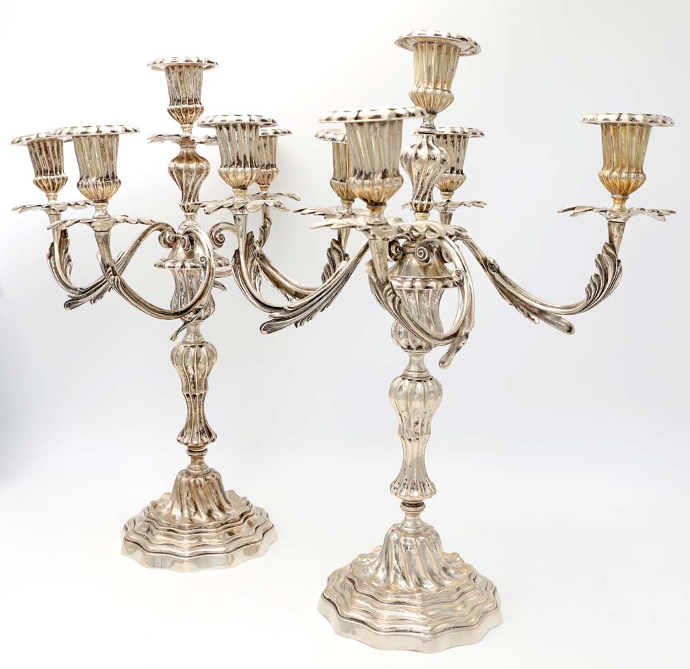 Coppia di candelabri in argento 800/000 a cinque luci cm 41,5x35 - peso complessivo gr. 4.674 bracci arcuati sottolineati da rilievi fogliacei con portacandela a vaso; stelo a balaustro segnato da nervature su piede circolare tortile con profilo gradinato e modanato