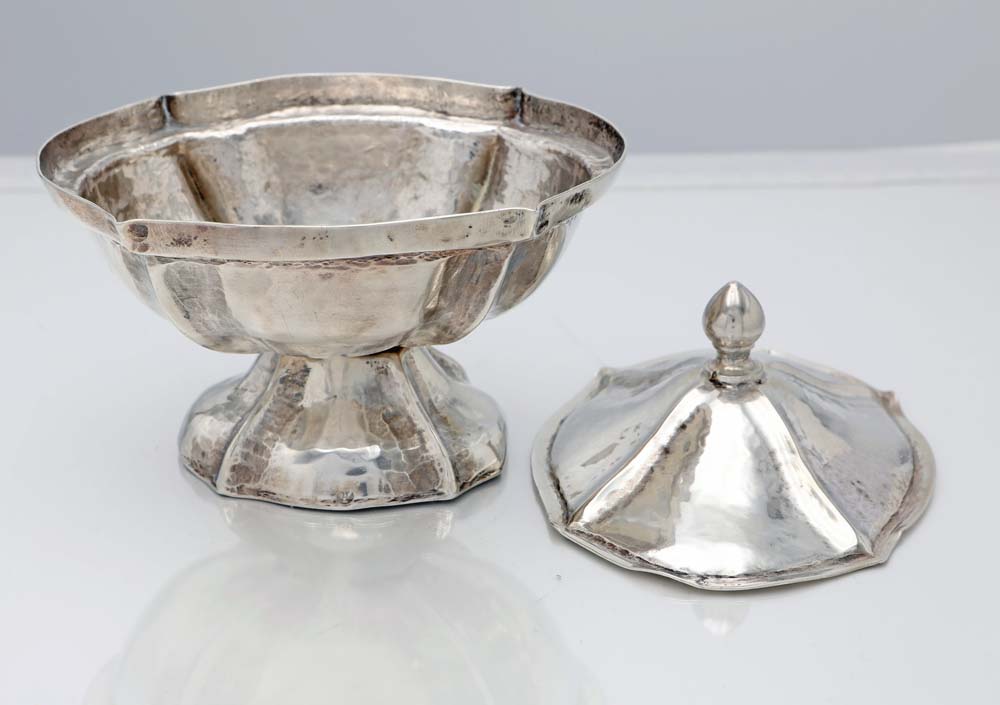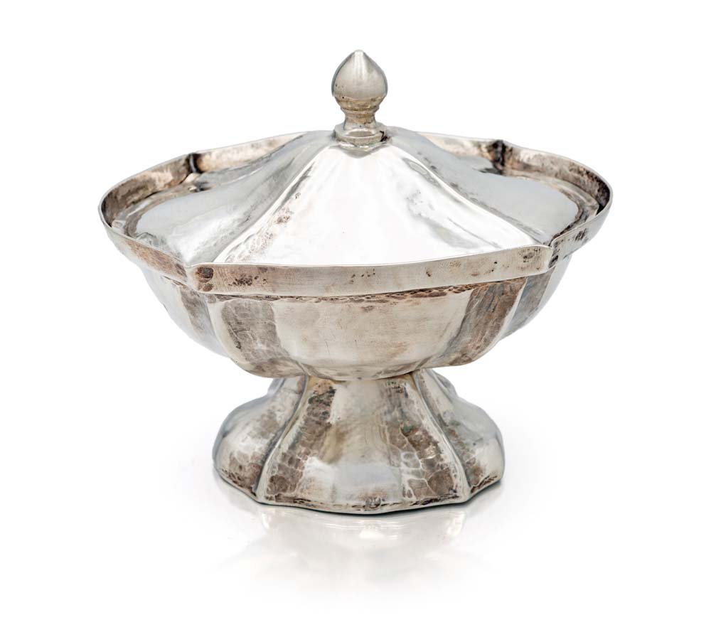 Zuccheriera in argento con coperchio cm 11x12,5x9,2 - gr. 256 vaschetta ovale battuta a mano con nervature e basso piede troncoconico; coperchio ad incasso sormontato da pomolo a pigna