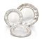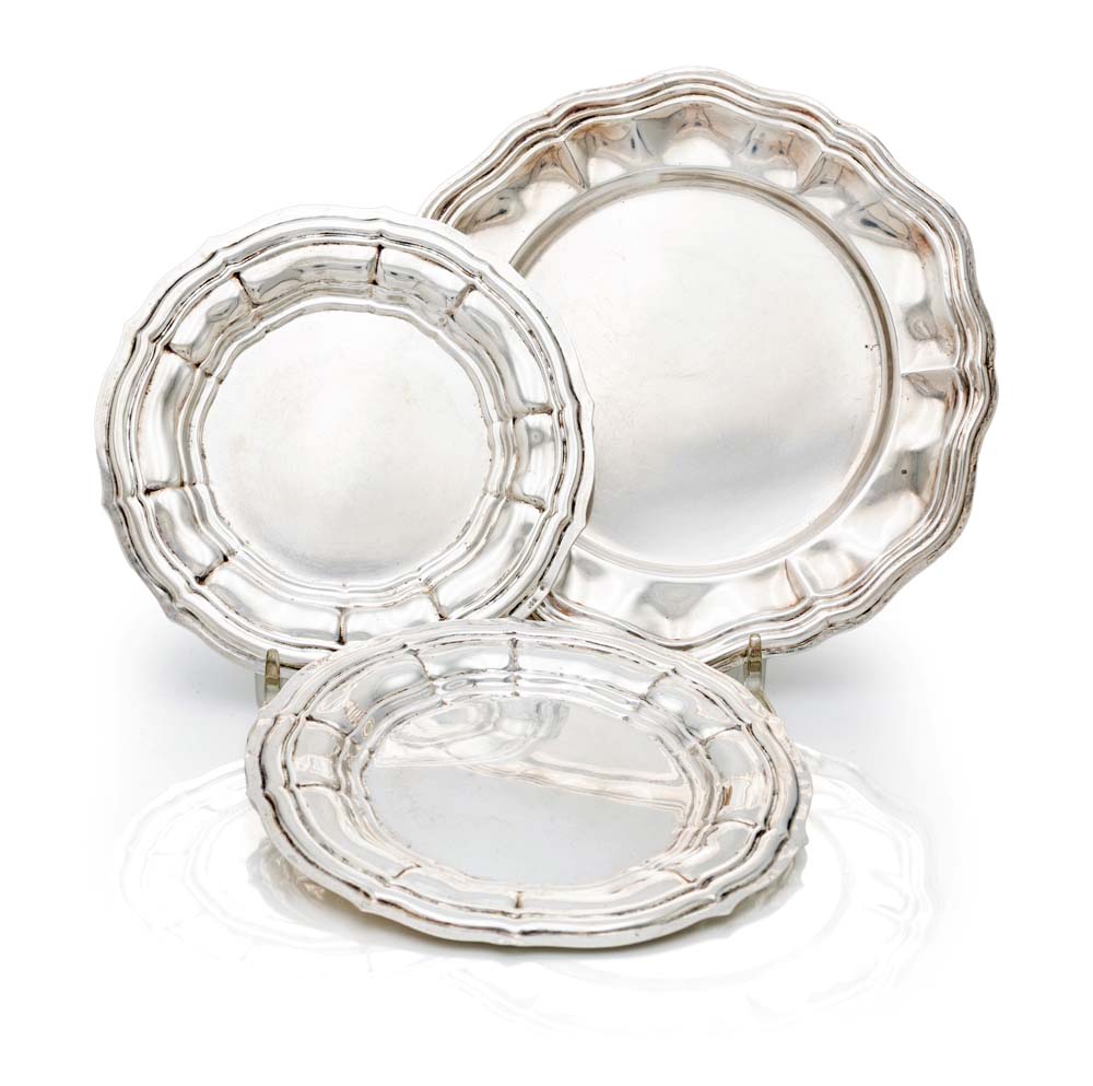 Tre piatti circolari in argento 800/000 dalle analoghe caratteristiche diametro cm 22 - cm 17 (la coppia) - peso complessivo gr. 502 di forma circolare con ampia tesa sagomata percorsa da nervature ed orlo piatto; una coppia da dessert ed il più grande dell'argentiere Alessandro Corradini di Bologna