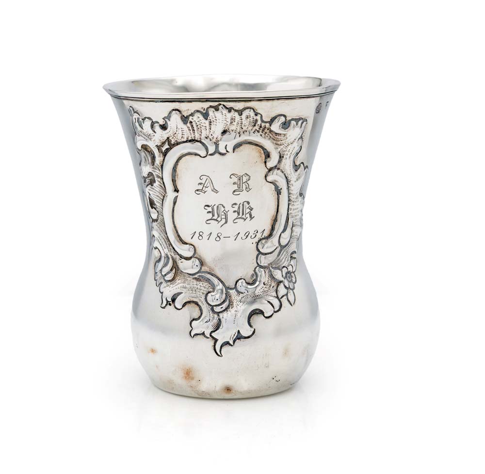 Calice in argento, prima metà del XIX secolo cm 10,5x8 - gr. 106 corpo cilindrico con leggera strozzatura a favorire la presa, caratterizzato da un ampio cartiglio sbalzato con iniziali e date incise