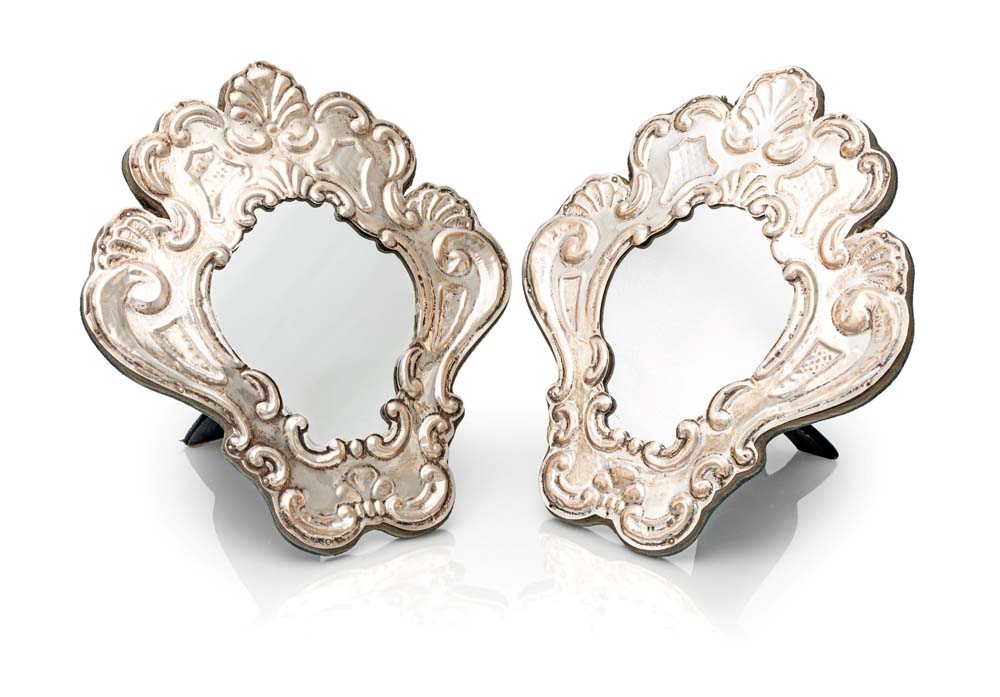 Coppia di cartegloria in lamina d'argento sbalzata con specchio cm 23x20,5...