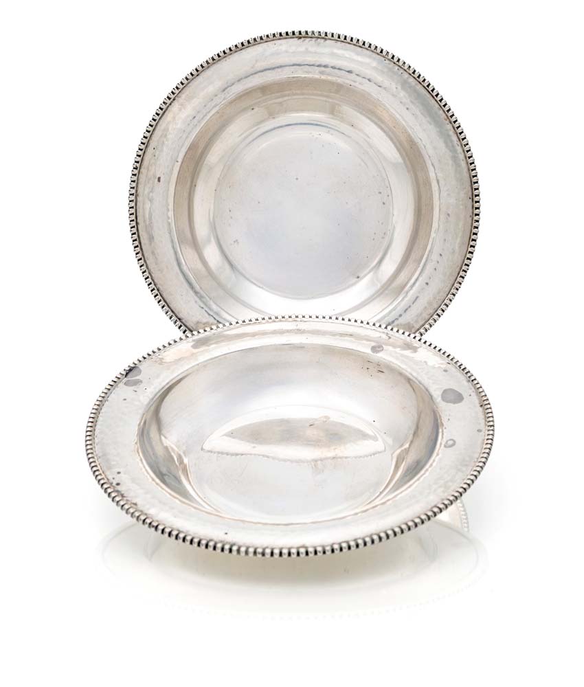 Coppia di piattini sottobottiglia in argento 800/000 diametro cm 15 , vano interno ø cm 8 - gr. 264 ampia tesa con orlo percorso da perlinatura