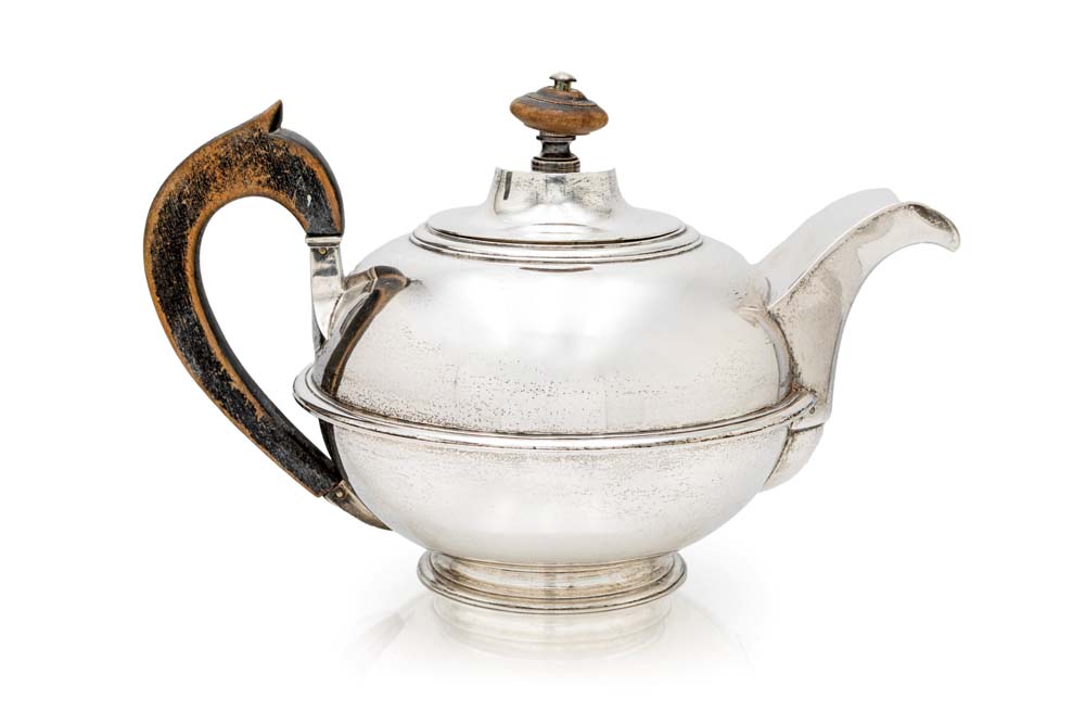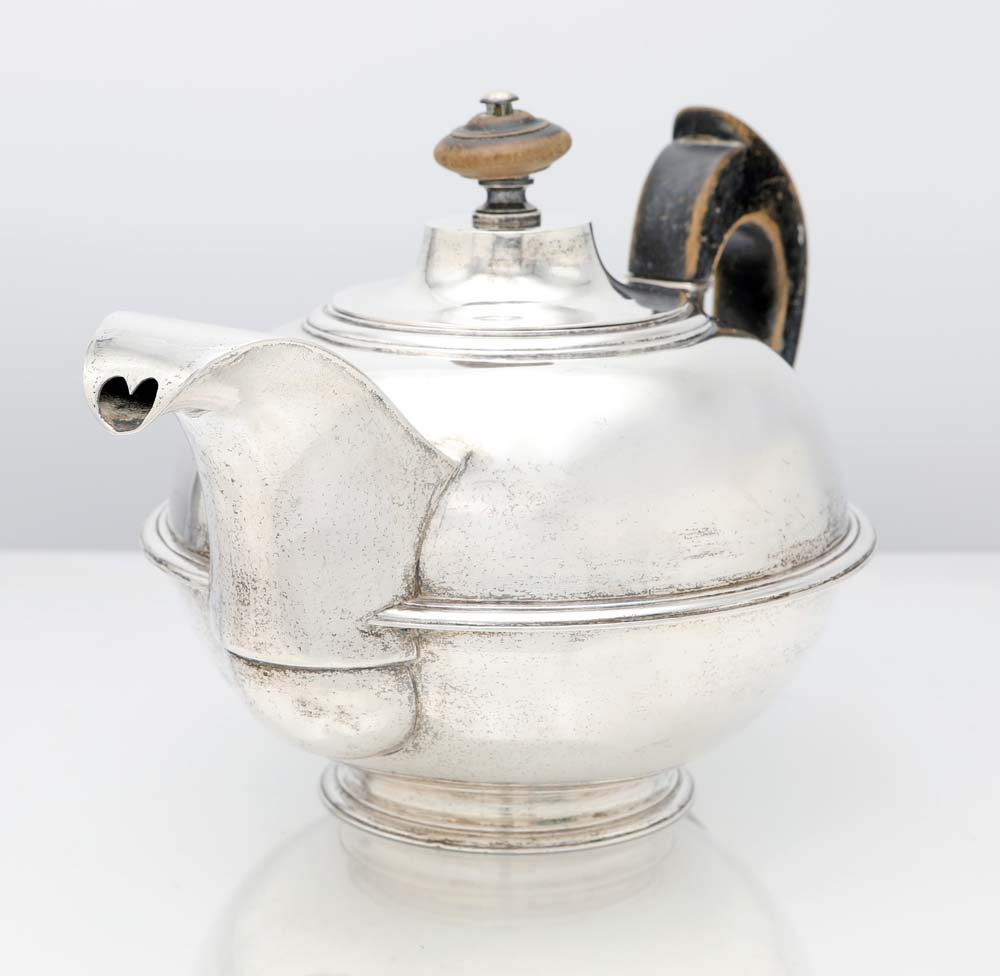 Teiera in argento cm 14,5x24,5x15 - gr. 866 corpo sferico, versatoio a becco arcuato con apertura a cuore, manico in legno