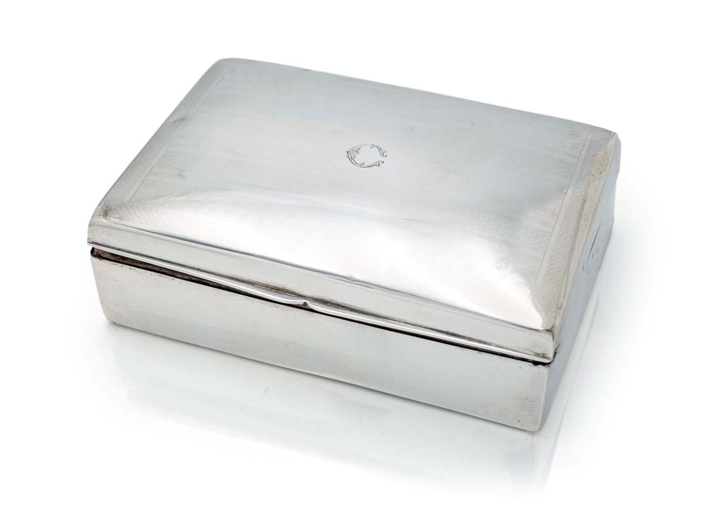 Scatola in legno rivestito in argento 800/000 cm 4x13,5x9 - peso lordo gr. 180 di forma rettangolare con coperchio incernierato e traccia di decorazione a fasce incise al bulino; al centro iniziale "C" incisa