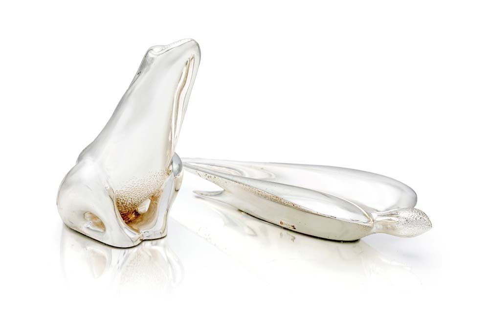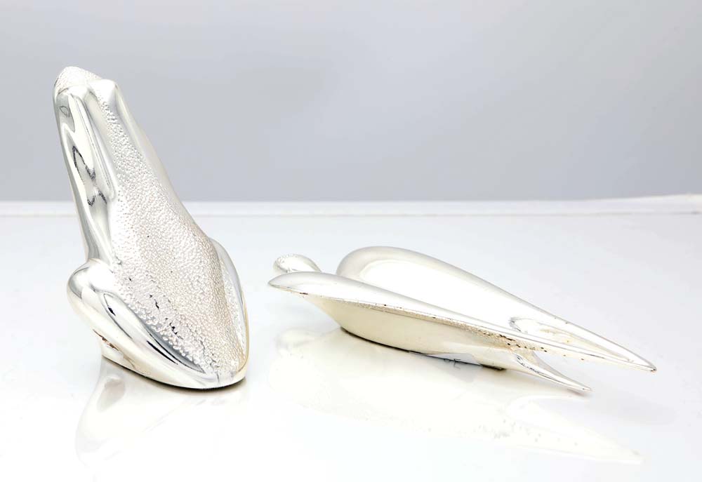 Ottaviani: Rana e rondine stilizzata in resina rivestita in argento altezza cm 9,5 e cm 2x16x6,5 la prima, reca etichetta di provenienza Ottaviani, opera depositata, Made in Italy