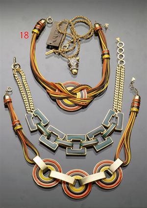 LANCETTI Collana in cordoncino colorato girocollo con elemento circolare smaltato arancio, marrone, giallo, anni '80 Cm 38 1980's multi-strand string choker with orange, brown and yellow enamel round medalion