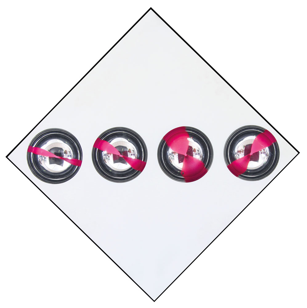 assemblaggio di materie plastiche, 4 semisfere in romboidale cm. 74x74x8 (lato cm. 52,5), firma e titolo incisi su un lato, dichiarazione d'autenticità dell'artista e timbro della Anti: galleria d'arte contemporanea (Mestre-VE) su foto.