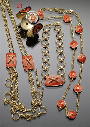 LANCETTI Bracciale ridido in metallo dorato composto da sei elementi circolari smaltati viola e arancio con pavè di Swarowski, anni' 80 Diam cm 7 1980's gold metal bangle composed of 6 purple and orange enamel round medalions with Swarovski