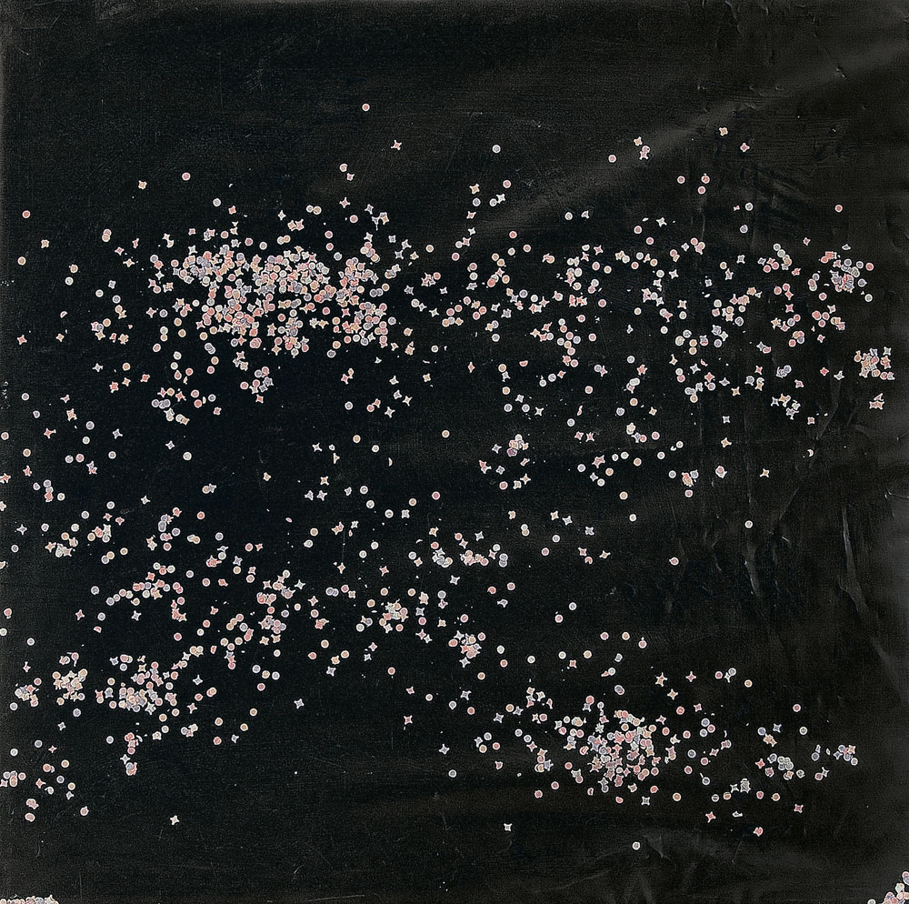 acrilici e coriandoli su tela con protezione in cellophane cm. 100x100, firma al retro, opera registrata presso l'Archivio Tano Festa a cura dello Studio Soligo come da dichiarazione su foto, opera priva di cornice.