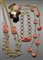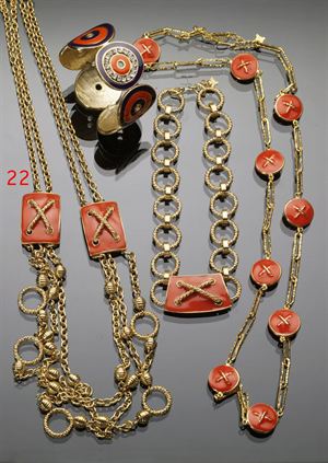 LAURA BIAGIOTTI Doppia catena dorata con mostrine rettangolari in smalto arancio X dorata applicata, anni '80 Cm 100 1980's gold colored double chained necklace with orange enameled rectangular madalions with gold X motif