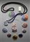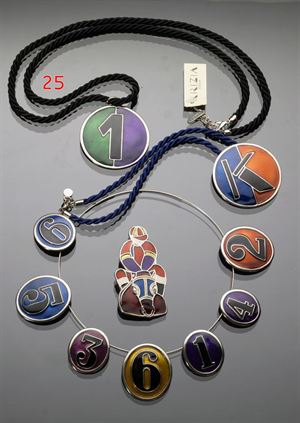 KRIZIA Collana lunga con cordoncino nero e ciondolo a forma di piccolo disco su base smaltata viola e verde con impresso in nero il numero 1, anni '80 Diam cm 5,5 1980's black corded necklace with round purple and green enameled medalion with black number 1 motif