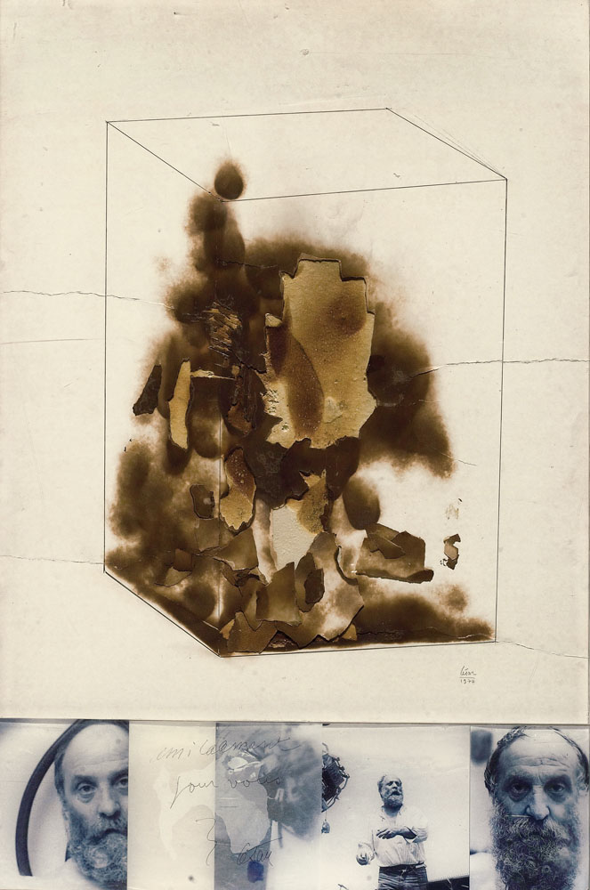 tecnica mista, combustione e collage su cartoncino e plexiglass cm. 104x69,5; firma e anno in basso a destra, dedica ad personam e firma in basso al centro, entro teca in plexiglass.