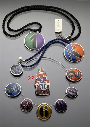 KRIZIA Spilla a forma di fantino in sella al cavallo colori bianco, blu,...