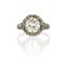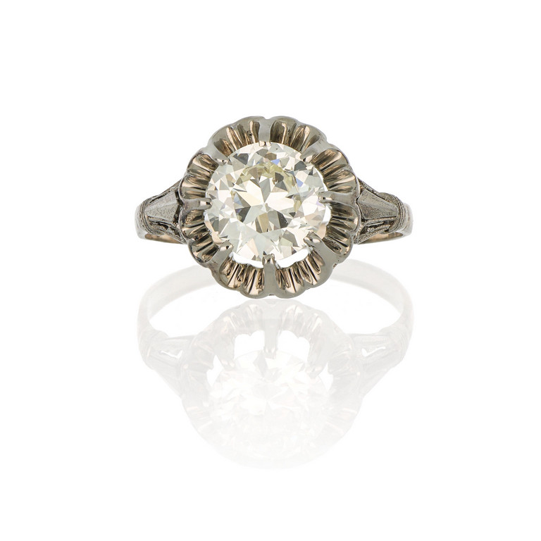 Anello a solitario in oro bianco, al centro un diamante taglio vecchia europa di ct. 1,80 ca., purezza stimata VVS/VS, colore tra K ed M, fluorescenza slight, 8,08 x 8,11 x 4,43 mm.