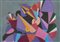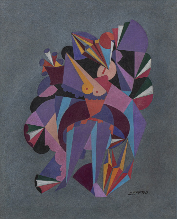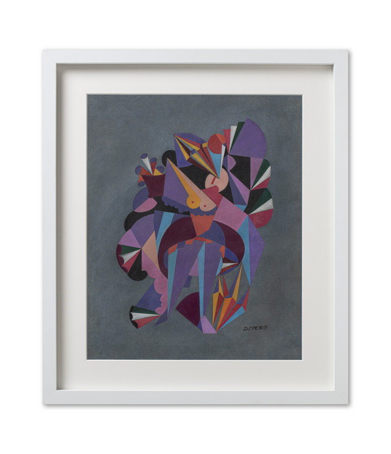 Verso la fine del 1916, Depero ricevette nel suo studio romano la visita di Diaghilev, impresario dei Balletti Russi che lo incaricò per la realizzazione dei costumi e le scenografie de “Il Canto dell’Usignolo” su musiche di Stravinsky, da realizzare per la primavera del 1917. Depero, memore della complessità plastica dei costumi che aveva ideato per “Mimismagia” (appunto mai realizzati per le difficoltà tecniche costruttive) stese due-tre idee iniziali di costumi (in questo caso una Ballerina) che si rivelarono subito troppo complessi e che quindi allegerì e poi realizzò con la tecnica del collage. L’intervento di Picasso che lo coinvolse nei costumi meccanici di “Parade” lo distolse dal completare il lavoro e quindi perse l’incarico. Quindi il presente dipinto, che è lo sviluppo cromatico di un precedente disegno a matita, è la pri-