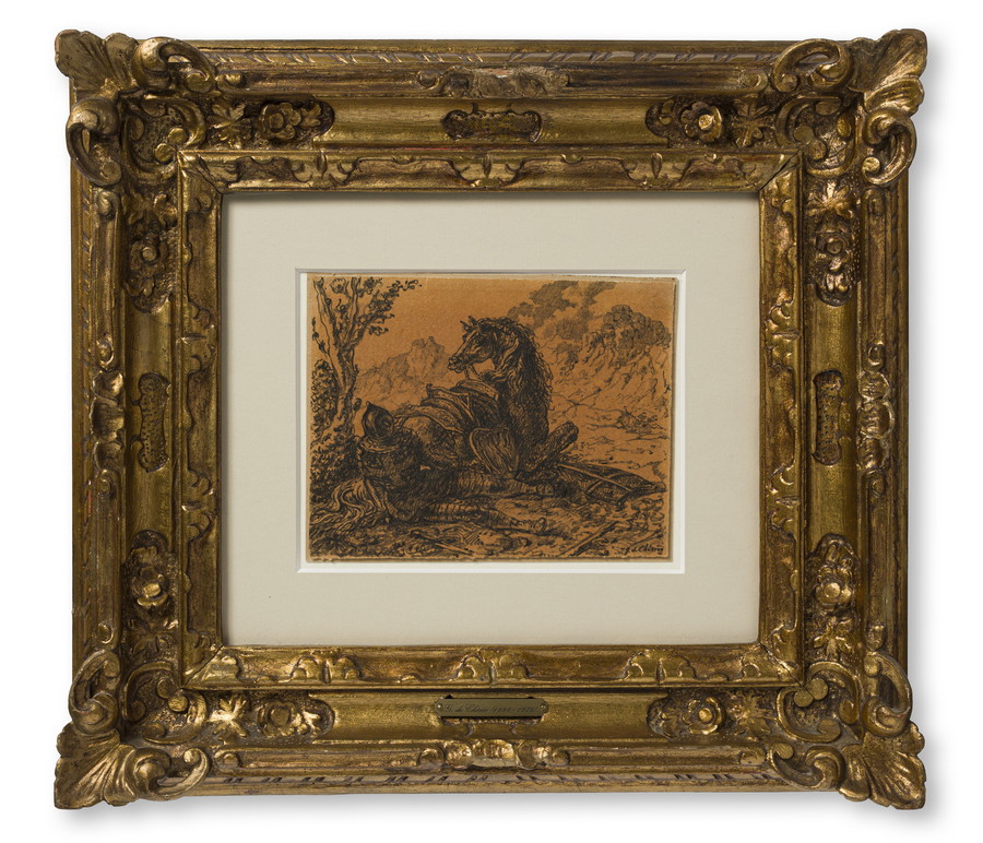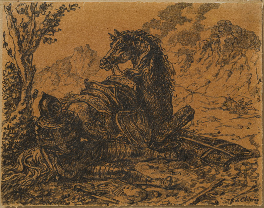 DE CHIRICO GIORGIO (1888 - 1978) IL CAVALIERE CADUTO. 1948. carboncino acquerellato su carta. Cm 21,80 x 16,20. firma