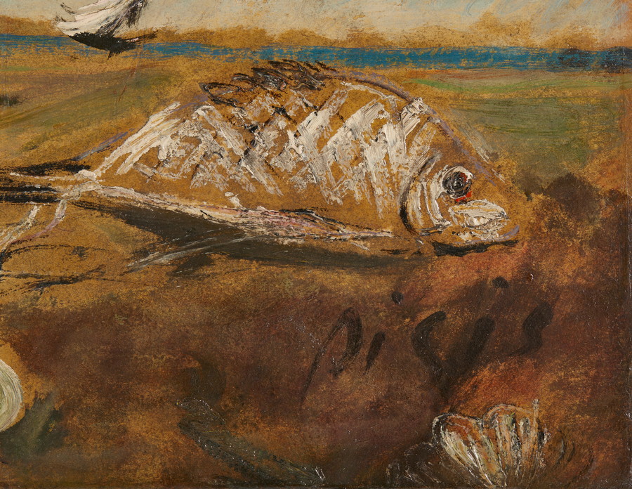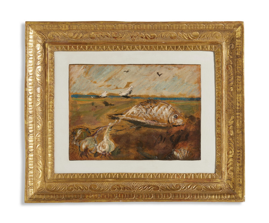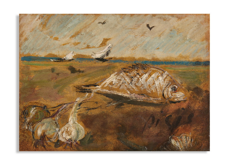 DE PISIS FILIPPO (1896 - 1956) COMPOSIZIONE CON PESCE, AGLI E VELA (1946-1947). olio su cartone applicato su tavola. Cm 32,00 x 23,00. firma