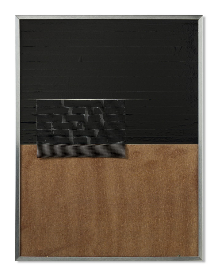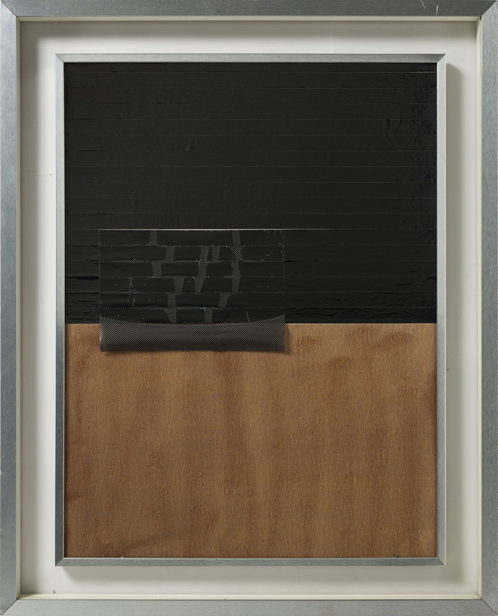 RAMA CAROL (1918 - 2015) LUOGO E SEGNI. 1975. nastro adesivo, pellicola di materiale plastico, pastello e carta da parati su tela vinilica bianca. Cm 60,00 x 79,80. sul retro: firma, titolo e data