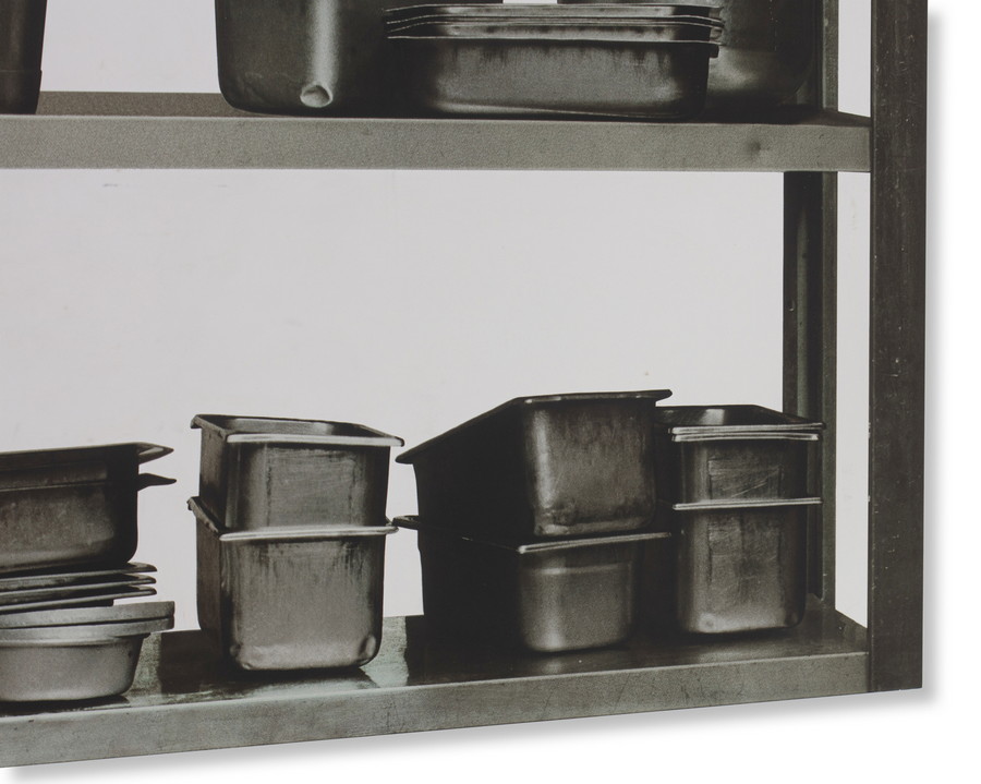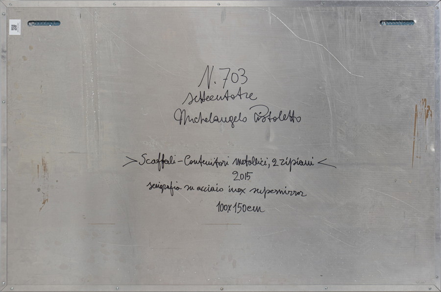 PISTOLETTO MICHELANGELO (n. 1933) SCAFFALI-CONTENITORI METALLICI, 2 RIPIANI. 2015. serigrafia su acciaio inox lucidato a specchio. Cm 150,00 x 100,00. sul retro: titolo, firma e data